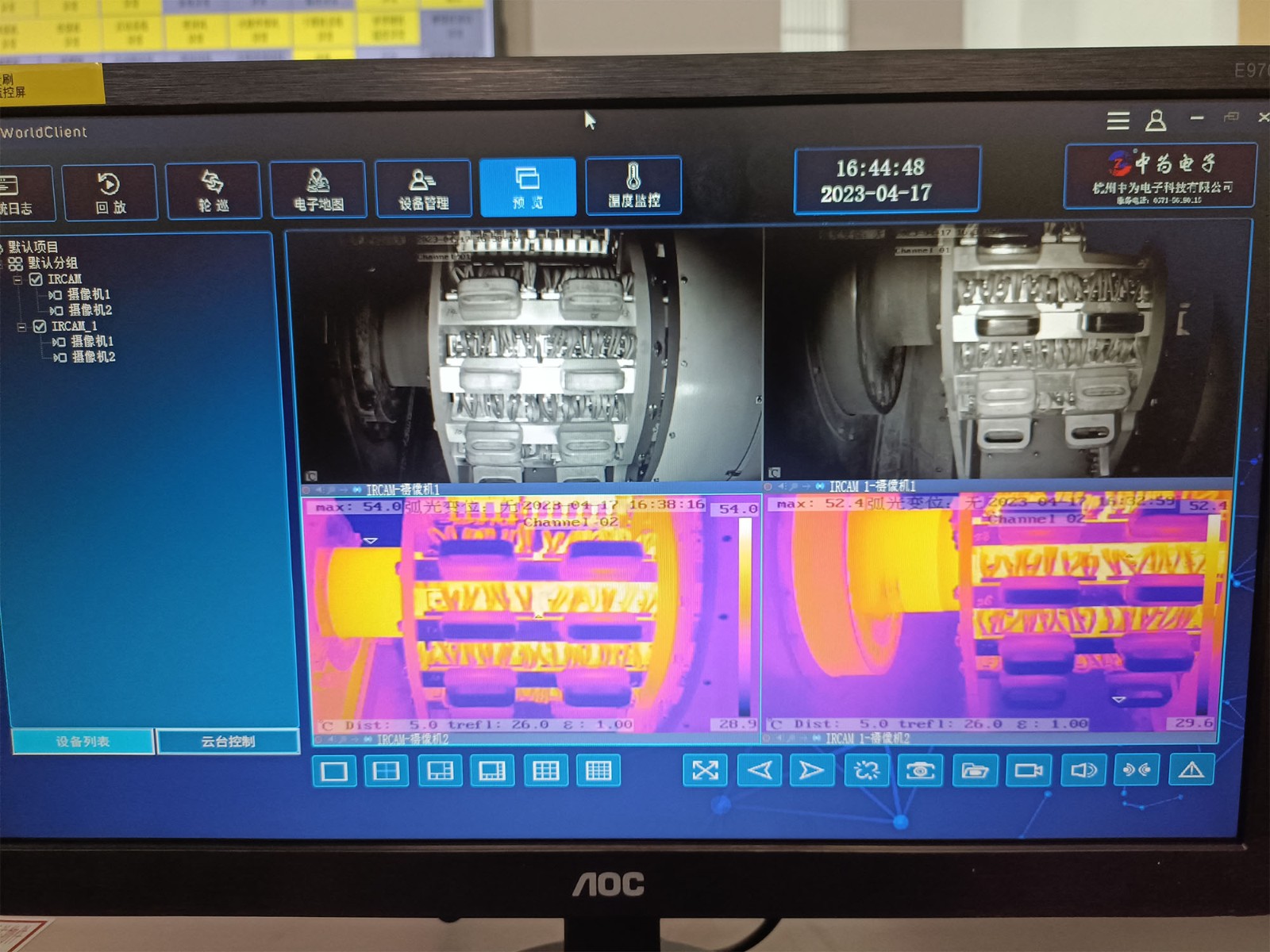 2023年4月,浙江浙能溫州發電有限公司7號機組完成安裝發電機碳刷紅外熱成像智慧分析系統增補,現場采用雙光融合熱成像儀,200w分辨率可見光與384*288分辨率熱像儀搭配,配合系統軟件全面升級,首創HyPix超分辨率顯示技術,可見光成像與紅外熱像圖技術雙光融合,利用復合調色聚焦成像技術,提高紅外熱圖像的清晰度,更好的展現設備細節。該技術可實現低分辨率高清成像,比如分辨率為384*288的紅外探測器,經軟件自動處理分析數據,可生成質量媲美640×480分辨率的熱像圖。優化界面布局,碳刷溫度情況直接顯示在紅外畫面左側,一目了然了解碳刷溫度分布情況,配合實時溫度曲線、月度報告等功能,全面監測碳刷多種運行重要參數,為發電機組安全運行保駕護航。