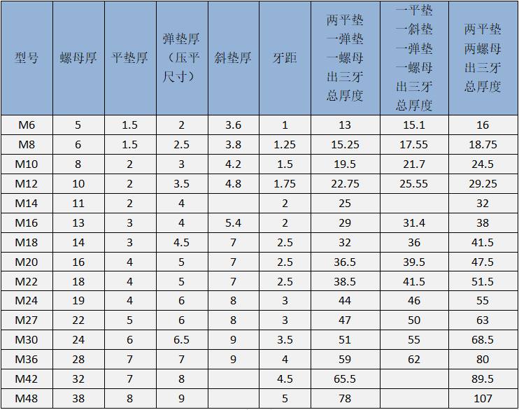 如M16熱鍍鋅螺栓,若采用兩平墊一彈墊一螺母出三牙的方式,則計算螺栓長H=3*2+4+13+2*3=29mm