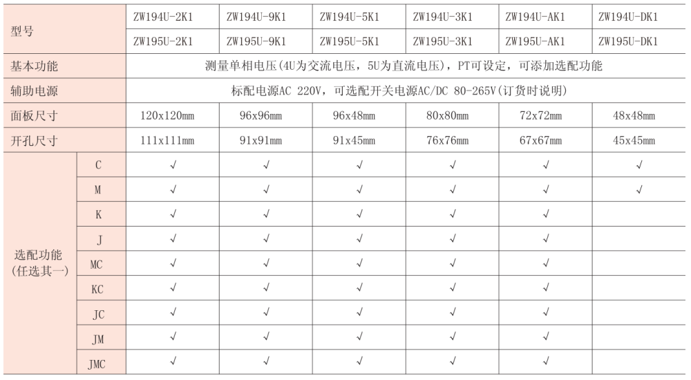 注:“√”代表可選配置,“J”代表報警輸出,“M”代表模擬量輸出,“K”代表開關(guān)量輸入,“C”代表